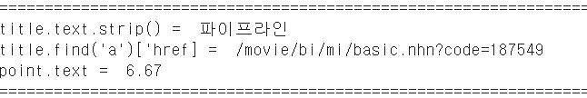 pointOfMovie = soup.findAll("td", {"class":"point"}) # class point 내용 불러오기 (평점)